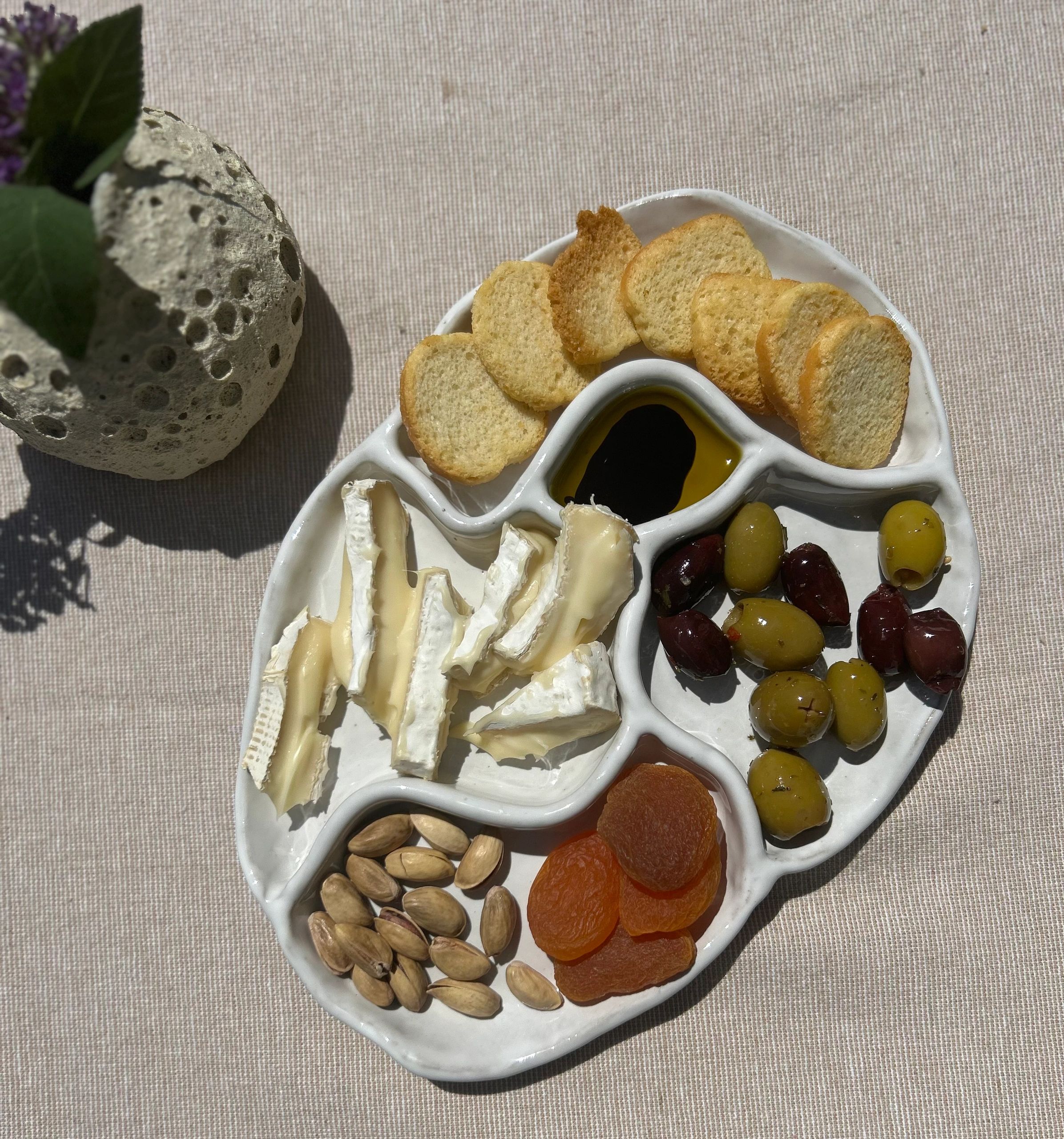 Each piece is thoughtfully hand-sculpted, with organic compartments designed to hold your favorite bites, whether you're curating a solo elevated snacking plate or hosting friends for an effortlessly chic spread.